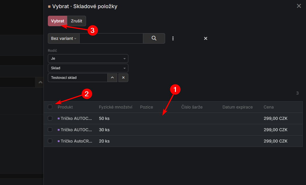 Po zpracování se produkty automaticky odečtou ze zdrojového skladu a přičtou na cílový.